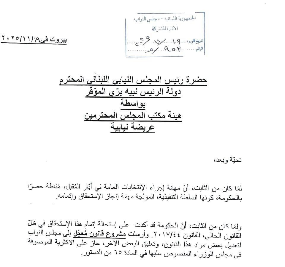 تقدّم مجموعة من النوّاب بتاريخ 19 تشرين الثاني 2025 بعريضة نيابيّة موجّهة إلى رئيس المجلس نبيه برّي يطلبون بموجبها "إحالة مشروع القانون المعجّل المحال من الحكومة والمتعلّق بتعديل وتعليق بعض مواد قانون الانتخابات العامة رقم 44/2017، إلى الهيئة العامة مباشرة، وعدم إحالته إلى إلى من اللجان، وبالتالي تعيين موعد جلسة في أقرب وقت ممكن، بعد إدراجه كبند أوّل على جدول أعمال وتلاوته ومناقشته والتصويت عليه."